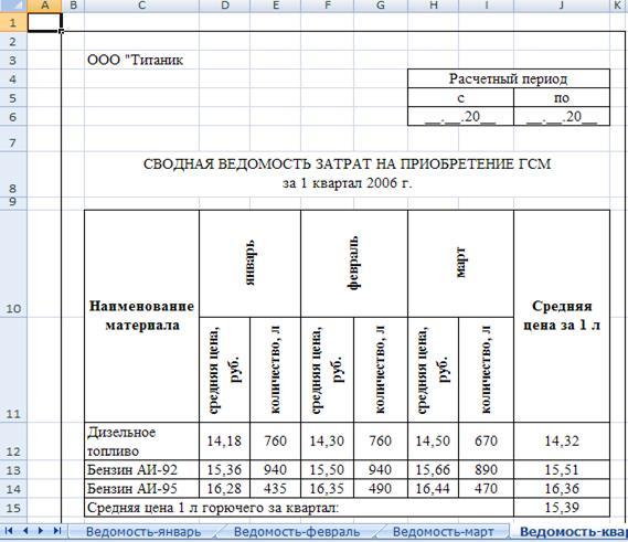 8. Лист 4 переименовываем в лист с названием «квартал», создаем таблицу «Ведомость затрат на приобретение ГСМ за 1 квартал 2006 г.» и заполняем ее исходными данными.