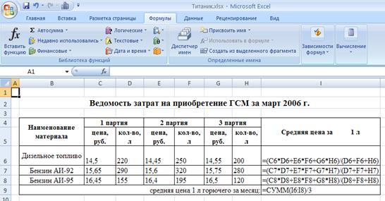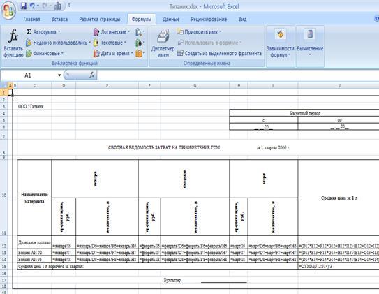 . Получаем шаблон выходного документа «Ведомость затрат на приобретение ГСМ за январь 2006 г.» с формулами расчета: