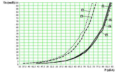 Рис. П.5.1. Зависимость допустимого значения звукового давления от величины звукового давления развиваемого в месте установки телефонного аппарата "Телур"
