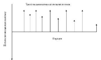 Як видно з рисунку 7, для інвестора початкові інвестиції мають знак "-", грошові потоки – знак "+". Якщо NPV>0, сума довжини відрізків дисконтованих грошових потоків повинна перевищувати довжину відрізка початкового вкладення капіталу. Коли ж NPV<0, ситуація буде зворотною, а; при NPV=0 довжина цих відрізків повинна збігатися.