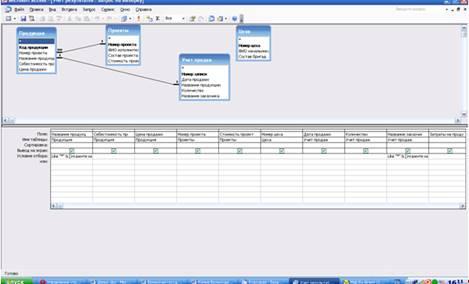 Выходная информация представляется в виде отчетов на экране монитора, печатных отчетов, а также в виде файлов на диске. Выходная информация может быть представлена так же в виде запроса. Структура запросов, содержащих план проектирования и изготовления, и продажи товаров, составленных по данным таблиц «Продукция», «Проекты», «Цеха», «Учет продаж» имеет следующий вид:
