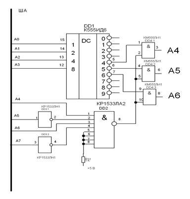 Будем использовать селектор адреса на дешифраторе и элементах "И" и "НЕ". Схема представлена на рисунке 8. Нам нужно сформировать 3 адреса А4, А5, А6. Т. е . можно адрес поделить на две половины для "отлавливания" А (для всех портов одинаков) и для 4,5,6.