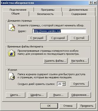 Настройка домашней страницы (Рис. 2.1.4.): Сервис Свойства обозревателя Общие Адрес: введите доменное имя (URL) домашней страницы Ok.
