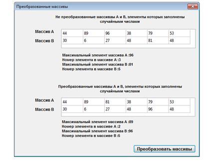 2.2 В заданных массивах А и В поменять местами максимальные элементы. Вывести на экран преобразованные массивы.