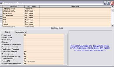 Каждые поля данных таблиц были снабжены соответствующими комментариями в поле «описание» в режиме конструктора. Значение данного поля отображается в строке состояния, при условии, если пользователь работает с таблицей в оперативном режиме и курсор при этом находится в одноименном столбце.