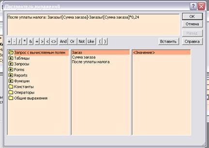Выражение для вычисляемого поля может состоять из имен полей различных таблиц и запросов, функций, чисел и так далее. Построитель дает возможность выбрать нужные поля из таблиц и запросов, функции из списка функций, знаки арифметических операций.