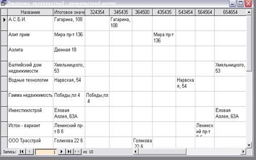 Перекрестные запросы предназначены для группирования данных и представления их в компактном виде. Запрос можно создать самостоятельно или воспользоваться Мастером. Из перекрестного запроса, созданного мной можно определить, стоимость каждого программного продукта по столбцу обновлений. В режиме конструктора такой запрос имеет вид:
