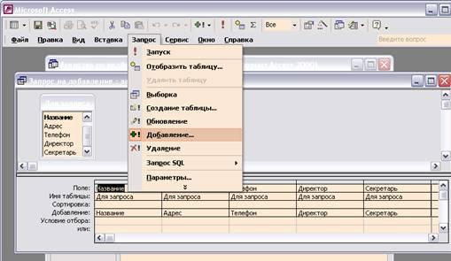 Запрос на заполнение столбца (добавление) позволяет скопировать данные из одной таблицы в другую, не прибегая к помощи буфера обмена. Записи могут перемещаться между разными файлами баз данных и между базами данных разного типа. В режиме конструктора такой запрос имеет вид: