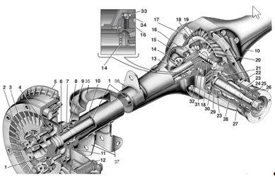 Рисунок 1.1 - Задний мост: 1 — полуось; 2 — болт крепления колеса; 3 — направляющий штифт; 4 — маслоотражатель; 5 — тормозной барабан; 6 — подшипник полуоси; 7 — запорное кольцо; 8 — фланец балки заднего моста; 9 — сальник полуоси; 10 — балка заднего моста; 11 — пластина крепления подшипника; 12 — щит заднего тормоза; 13 — направляющая полуоси; 14 — регулировочная гайка; 15 — подшипник коробки дифференциала; 16 — крышка подшипника; 17 — сапун; 18 — сателлит; 19 — ведомая шестерня; 20 — шестерня полуоси; 21 — регулировочное кольцо ведущей шестерни; 22 — распорная втулка; 23 — подшипники ведущей шестерни; 24 — сальник ведущей шестерни; 25 — грязеотражатель; 26 — фланец; 27 — маслоотражатель; 28 — картер редуктора заднего моста; 29 — ведущая шестерня; 30 — ось сателлитов; 31 — регулировочная шайба; 32 — коробка дифференциала; 33 — болт крепления стопорной пластины; 34 — стопорная пластина гайки подшипника; 35 – опорные чашки пружин задней подвески; 36,37 – кронштейны крепления деталей подвески.