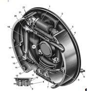 Рисунок 3.2 – Тормозной механизм заднего колеса: 1 – колесный цилиндр; 2 – верхняя стяжная пружина колодок; 3 – накладка колодки; 4 – щит тормоза; 5 – внутренняя пластина; 6 – оболочка заднего троса; 7 – нижняя стяжная пружина колодок; 8 – передняя тормозная колодка; 9 – опорная пластина колодок; 10 – заклепки; 11 – маслоотражатель; 12 – направляющая пластина колодок; 13 – задний трос стояночного тормоза; 14 – пружина заднего троса; 15 – наконечник заднего троса; 16 – задняя тормозная колодка; 17 – опорная стойка колодки; 18 – рычаг ручного привода колодок; 19 – резиновые подушки; 20 – распорная планка колодок; 21 – палец рычага ручного привода колодок; 22 – шплинт.