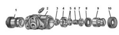 Рисунок 4.6 - Детали колесного цилиндра: 1 — поршень в сборе; 2 — корпус цилиндра; 3 — упорный винт; 4 — упорное кольцо; 5 — сухари; 6 — пружина; 7 — опорная чашка; 8 — уплотнитель; 9 — поршень; 10 — защитный колпачок.