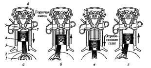 Рис. 2.3. Схема рабочего процесса четырехтактного бензинового двигателя: а — впуск; 6 — сжатие; в — рабочий ход; г — выпуск; / — коленчатый вал; 2 — шатун; 3 — цилиндр; 4 — поршень; 5 — выпускной клапан; 6 — распределительный вал; 7 — впускной клапан