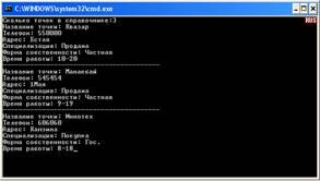 После выбора необходимого поиска появится окно для ввода указанных параметров. После того, как пользователь введёт параметры поиска, появится окно, содержащее непосредственно заданные параметры поиска и таблицу, в которой представлены торговые точки, удовлетворяющие этим параметрам. Для выхода в меню поиска требуется нажать любую клавишу.