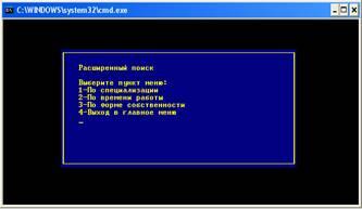 Для перехода в меню поиска необходимо в главном меню нажать цифру «4», соответствующую строке «Расширенный поиск» и нажать клавишу Enter. В центре экрана появится окно, содержащее меню поиска. В этом меню указаны три вида поиска, реализованные в программе. Их выбор осуществляется цифрами от «1» до «3». Для выхода в главное меню необходимо нажать на числовой клавиатуре клавишу «4» («Выход в главное меню») и нажать клавишу Enter.