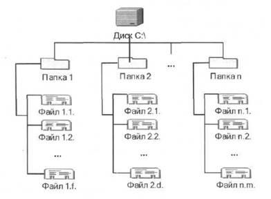 В иерархической БД существует упорядоченность элементов, для которой характерна подчиненность объектов нижнего уровня (потомков) объектам верхнего уровня {предкам), что продемонстрировано на Рис.1. Иерархию образуют, например, папка с файлами, хранимыми на диске, а дерево папок - наглядный пример иерархической структуры БД.