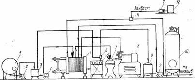 1 – пластинчатый пастеризатор; 2 – молокоочиститель ОМА-3М; 3 – балансировочный бак; 4 – центробежный насос для молока; 5 – регулятор потока; 6 – бойлер; 7 – насос для горячей воды; 8 – инжектор; 9 - гомогенизатор А1-ОГМ; 10 – выдерживатель пастеризованного молока Г6-ОПБ-1000; 11 – насос центробежный; 12 – щит управления