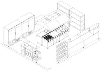 На рисунке показано, как размещается стандартный набор технологического, холодильного и вспомогательного оборудования в горячем цехе ресторана с количеством посадочных мест более 70. Далее рассмотрим непосредственно оборудование:
