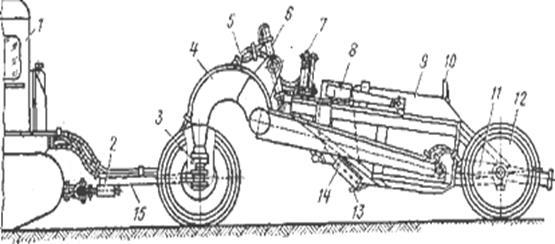 Причіпні скрепери з гідравлічним управлінням (мал. 2) складаються з сережки для зчеплення скрепера з трактором, шкворневого пристрої для повороту передніх коліс, що несе рами, ковша, заслінки і задньої стінки. Робочими органами управляють з кабіни трактора за допомогою важелів управління трьохсекційним гідророзподілювачем.