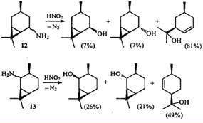 В данном случае перегруппировка Вагнера-Меервейна, протекающая как алкильный сдвиг, не приводит к изменению карановой структуры. Однако алкильный сдвиг возможен лишь потому, что в образующемся вторичном ионе 16