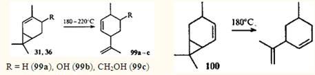 в основном приведены перегруппировки карановых монотерпеноидов, в которых циклопропановое кольцо (ЦПК) раскрывается по внешним связям с образованием соединений ряда п