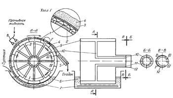 Среди фильтров непрерывного действия наиболее распространены барабанные вакуум-фильтры. Схема такого фильтра представлена на рис.4. Фильтр имеет вращающийся цилиндрический перфорированный барабан 1, покрытый металлической волнистой сеткой 2, на которой располагается тканевая фильтрующая перегородка 3. Барабан на 30—40% своей поверхности погружен в суспензию. Поскольку в данном фильтре направление осаждения твердых частиц противоположно направлению движения фильтрата, в корыте 6 для суспензии установлена качающаяся мешалка 7, поддерживающая ее однородность.