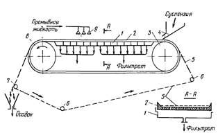 Осадок благодаря вакууму подсушивается и при перегибе ленты через валик 7 отделяется от ткани и сбрасывается в бункер. На обратном пути между роликами б фильтровальная ткань обычно регенерируется: очищается с помощью механических щеток, пропаривается или промывается жидкостью.