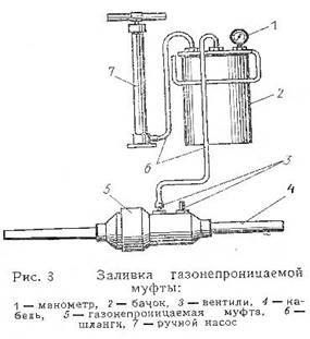 После сварки частей муфты приступают к заливке компаунда. Заливочный бачок устанавливают выше самой муфты, штуцер бачка с помощью полиэтиленовой трубки соединяют с вентилем муфты. На другой вентиль надевают отрезок трубки длиной 15 см. К штуцеру подачи воздуха в бачок подсоединяют шланг от ручного насоса. Расфасованные компоненты компаунда ЭТЗК и отвердитель заливают в полиэтиленовый пакет, предварительно вставленный в бачок, и тщательно перемешивают.