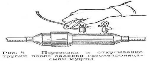 После того как масса станет однородной, бачок герметично закрывают крышкой. С помощью автомобильного насоса в него нагнетают воздух до создания давления 9,8×10⁴Па, которое контролирует манометр. Под действием этого давления компаунд выдавливается из бачка и по полиэтиленовой трубке поступает в муфту до появления компаунда из второго вентиля через отрезок трубки, которую немедленно перегибают и перевязывают (рис.3). Через 2-3 минуты полиэтиленовую трубку первого вентиля также пережимают и перевязывают. Затем осторожно ослабляют прижимы бачка, снимая в нем давление, и обрезают трубку выше пережима (рис.4).
