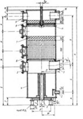 Рис.2. 1 – входной патрубок горячих газов; 2 – штуцер для отвода нагретой воды; 3 – переливной патрубок (труба); 4 – корпус; 5 – люк; 6 – рабочий слой кольцевых насадок, уложенных рядами; 7 – то же, загруженных навалом; 8 – каплеулавливающий насадочный слой; 9 – люк-взрывной клапан; 10 – патрубок для отвода охлажденных газов; 11 – водораспределитель производить подсушку дымовых газов.