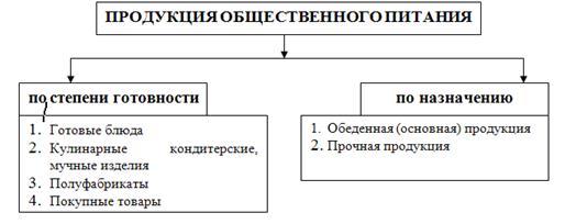 Продукция общественного питания – совокупность производимых и реализуемых блюд, кулинарных и кондитерских изделий, полуфабрикатов и готовых к потреблению продуктов предприятий пищевой промышленности и сельскохозяйственных производителей, т.е. в составе продукции выделяют продукцию собственного производства и покупные товары.
