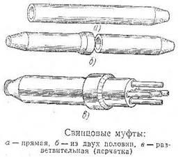 Свинцовые муфты служат для герметичного соединения между собой оболочек двух или нескольких кабелей и по назначению разделяются на соединительные, прямые и разветвительные. Соединительные прямые муфты используют для соединения двух кусков кабеля одинаковой емкости. Если емкость превышает 100X2, муфту выполняют из двух частей и обозначают буквой П. Разветвительную муфту (перчатку) используют для соединения одного кабеля большей емкости с несколькими кабелями меньшей емкости. Эти муфты имеют круглую или плоскую форму и буквенные обозначения РК и РПл. На конце одной половины муфты имеется несколько полых цилиндрических пальцев для ответвления кабелей. Свинцовые муфты показаны на рисунке ниже.