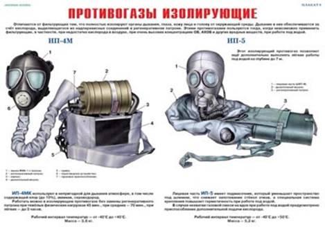 ИП-5, ИП-46, ИП-46м) являются специальными средствами защиты органов дыхания, глаз, кожи лица от всех вредных примесей, содержащихся в воздухе. Их используют в том случае, когда фильтрующие противогазы не обеспечивают такую защиту, а также в условиях недостатка кислорода в воздухе. Необходимый для дыхания воздух обогащается в изолирующих противогазах кислородом в регенеративном патроне, снаряжённом специальным веществом (перекись и надперекись натрия).