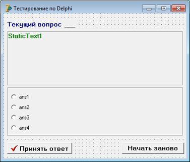 Для вывода вопросов, ввода ответов пользователя предусмотрим отдельную форму FormTest. Список объектов, используемых в форме приведен в таблице 2.2, а внешний вид приведен на рисунке 2.2.