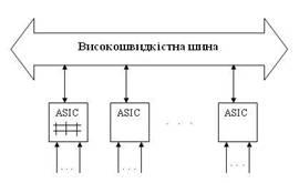 Комутатор складається з модулів з фіксованою кількістю портів (2-12), виконаних на основі спеціалізованій ВІС, що реалізує архітектуру комутаційної матриці. Якщо порти, між якими потрібно передати кадр даних, належать одному модулю, то передача кадру здійснюється процесорами модуля на основі наявної в модулі комутаційної матриці. Якщо ж порти належать різним модулям, то процесори спілкуються по загальній шині. При такій архітектурі передача кадрів всередині модуля буде відбуватися швидше, ніж при міжмодульній передачі, тому що комутаційна матриця - найбільш швидка, хоча й найменш масштабований спосіб взаємодії портів. Швидкість внутрішньої шини комутаторів може досягати десятки Гбіт/с.