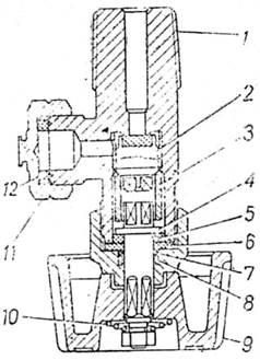 1-корпус; 2-клапан; 3-муфта; 4-шпиндель; 5 і 7-уплотнюючі кільця; 6-прокладка; 8-захисне кільце; 9-маховичок; 10- пружина; 11-заглушка; 12-прокладка