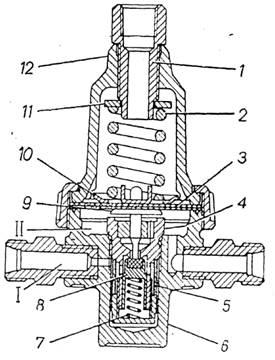 І-камера високого тиску; ІІ-камера робочого тиску; 1 -штуцер. 2 - пружина, 3-мембрана; 4-сідло клапана; 5-фільтруючий елемент; 6-корпус; 7-пружина; 8-клапан;- 9-шпиндель; 10-опорний диск; 11-упорна шайба; 12-кришка