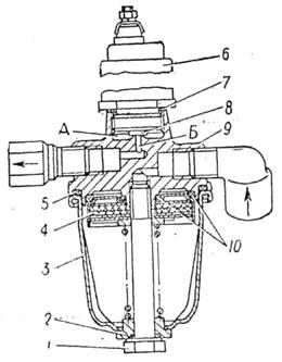 А-порожнина клапана; Б-отвір; 1-болт; 2, 5 і 10-ущільнюючі кільця; 3 - відстійник; 4-фільтруючий елемент; б - електромагнітний клапан; 7-прокладка; 8-клапан; 9-корпус