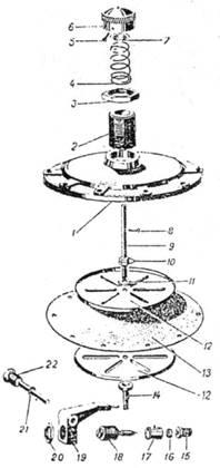 Розвантажувальний пристрій - діафрагменно-пружинного типу. Порожнина ІІІ якого з'єднана з впускною трубою двигуна. При розрідженні 70-80 мм водяного стовпа розвантажувальний пристрій відключається і розвантажує клапан другої ступіні редуктора. Пристрій редуктора і його окремих вузлів показане на мал. 7.9 , 10 і 11. На вході газу в редуктор установлений сітчастий фільтр.