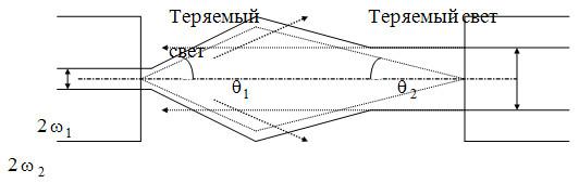 Волокно 1 с диаметром поля моды излучает свет в виде конуса с углом от торца волокна. Учитывая, что диаметр поля поля волокна обратно пропорционален углу приема излучения ( ) волокно 1 излучает свет в больший конус, чем принимает волокно 2, и часть излучения теряется. И наоборот, при распространении света от волокна 2 к волокну 1 часть света распространяется вне сердечника волокна 1 и тоже теряется.