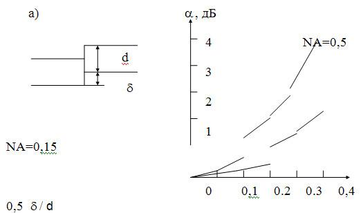 Внешние потери обусловлены четырьмя основными причинами: радиальное смещение волокон, угловое смещение, осевое смещение и качество торцов. Кроме того, необходимо учитывать деформации сердечника и соответствие между показателями преломления волокон. Для получения малых потерь на стыке торцов волокон должны находиться в тесном физическом контакте друг с другом, или зазор между ними должен быть заполнен веществом (иммерсионной жидкостью) в точности соответствующим показателям преломления сердечников волокон. На рис. 3 представлены возможные дефекты сопряжения оптических волокон и графики, отражающие количественную оценку внешних потерь.
