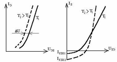 С ростом температуры тепловой ток IЭО растет быстрее, чем убывает экспонента из-за увеличения jТ = kT/q. В результате противоположного влияния двух факторов входные характеристики схемы с ОБ смещаются влево при выбранном токе IЭ на величину ΔU (1...2) мВ/°С (рисунок 4,а).