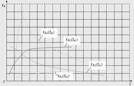 Рисунок 12—Частотные KE(f) характеристики усилителей (масштаб для: KE (f н1)=2:1, KE(f в1)=2:1, KE(f н2)=200:1, KE(f в2)= 200:1, f н1=100:1, f в1=10:1, fн2=100:1, f в2= 1:200)