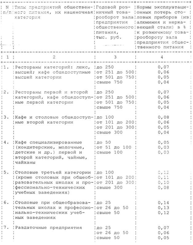 Среднеотраслевые нормы эксплуатационных потерь столовой посуды, приборов, столового белья, санспецодежды, производственного инвентаря на предприятиях общественного питания и инструкции о порядке их применения, утвержденные приказом Минторга ССР от 29.12.1982 № 276 /СПС Консультант плюс/