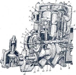 (рис. 3) состоит из двух чугунных половин, соединенных болтами. К передней части картера через плиту 20