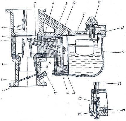 Карбюратор К-16 (рис. 4) – однодиффузорный с горизонтальным потоком и со сбалансированной поплавковой камерой. В средней части горизонтального патрубка сделано сужение, образующее диффузор 13