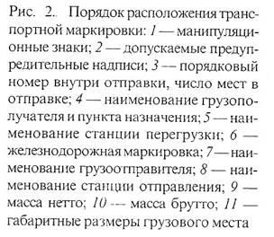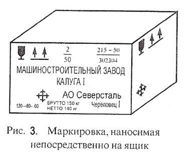 На рис. 3. в приложении 2 показана транспортная маркировка, нанесенная непосредственно на ящик. Грузоотправители и транспортные организации обязаны строго соблюдать требования Правил и стандартов по маркировке, имея в виду, что с помощью ее устанавливается связь между грузом и перевозочным документом, определяется его принадлежность в случае разъединения от документов, осуществляется информация работников о мерах предосторожности и способах обращения с упакованной продукцией при транспортировке и хранению.