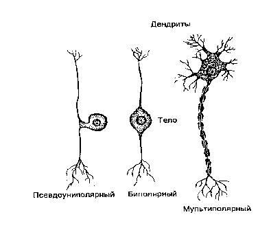 По количеству цитоплазматических отростков принято различать униполярные, биполярные и мультиполярные нейроны. Униполярные нейроны имеют единственный, обычно сильно разветвленный первичный отросток. Одна из его ветвей функционирует как аксон, а остальные - как дендриты. Такие клетки часто встречаются в нервной системе беспозвоночных, а у позвоночных они обнаруживаются лишь в некоторых ганглиях вегетативной нервной системы.