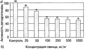 Активность почвенных ферментов сильно зависела от содержания металла в почве. При внесении в почву 0,25 ПДК свинца активность каталазы снижалась до 99 % контроля, (Рис.2 а), дегидрогеназы — до 88 % (Рис. 2 б). При внесении дозы 10 ПДК активность каталазы падала до 74 %, дегидрогеназы — до 50 %. Уменьшение активности исследованных окислительно-восстановительных ферментов объясняется ингибирующим воздействием свинца.