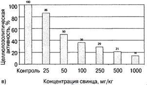 Чувствительным показателем проявила себя целлюлозолитическая активность почвы (рис. 2, в). Загрязнение чернозема свинцом привело к значительному снижению его клетчаткоразрушающей способности.
