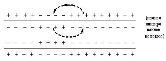 В нервных волокнах характер распространения возбуждения зависит от наличия или отсутствия в них миелиновых оболочек. В безмякотных волокнах возбуждение распространяется непрерывно вдоль всей мембраны. Все участки мембраны при этом в свое время становятся возбужденными. В мякотных нервных волокнах возбуждение арспространяется несколько по иному.